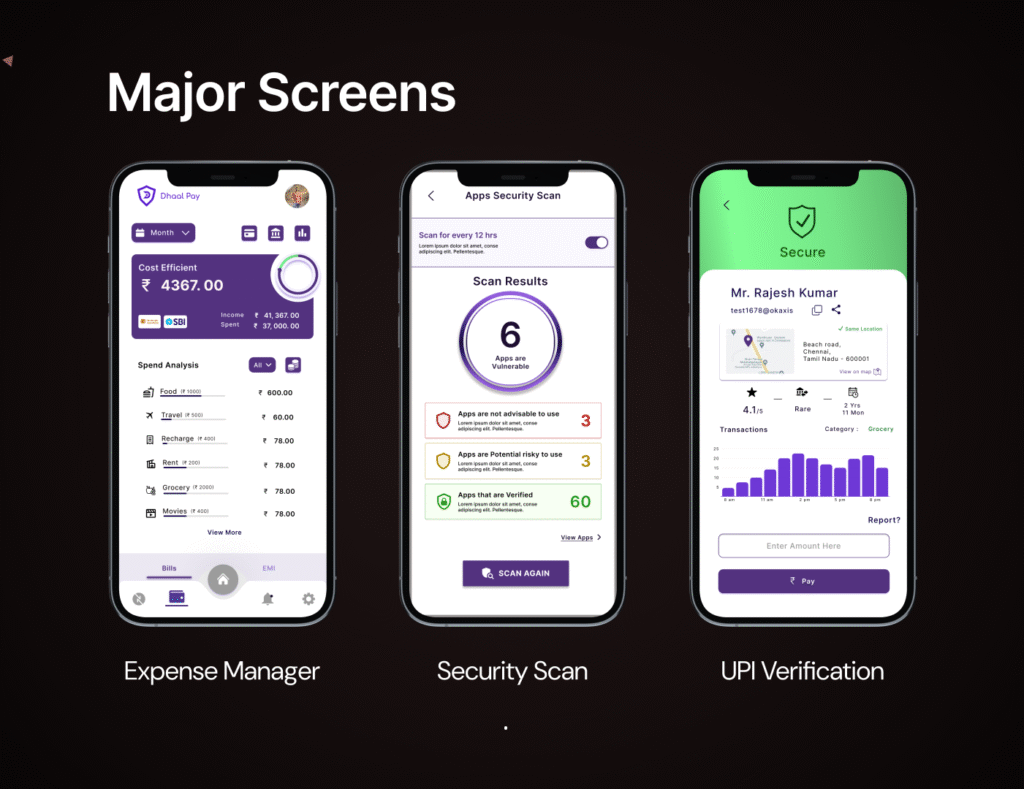 The goal of Dhaal Pay was simple but ambitious: empower users to verify UPI IDs and enhance their financial safety while providing value-added tools for personal finance management.